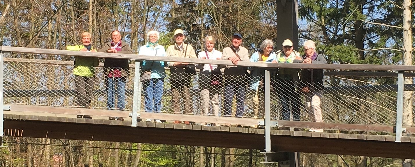 Montag, 2. Mai, (Egon 82. Geburtstag) war zur freien Verfügung. Unsere Gruppe hat das genutzt, um im Naturerbe-Zentrum Rügen auf einen Baumwipfelpfad zu gehen. Den Aufstieg auf den 40 Meter hohen Turm, gebaut wie ein Adlernest, haben hier auch noch alle geschafft. Oben hatte man eine herrliche Aussicht über die Insel, auf Ostsee und Küste und auf der anderen Seite auf Bodden und unendliche Waldgebiete. Nach einem kleinen Imbiß ging es mit dem Linienbus zurück zum Hotel. Nach dem Abendessen in das zum Hotel gehörende Lokal, wo man Bekanntschaft machte mit der "scharfen Suse" und lernen musste, die Bierdeckel nicht mit Strichen zu beschmieren.